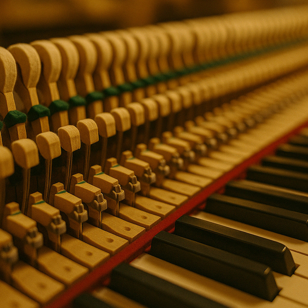 La calidad del teclado determina la comodidad y la capacidad de respuesta del instrumento. En F. KAIM & SOHN, cada tecla se fabrica con madera de abeto de grano fino, cuidadosamente seleccionada y estabilizada mediante secado natural durante varios meses. Esta madera, conocida por sus propiedades acústicas y su resistencia, garantiza una transmisión óptima del tacto.